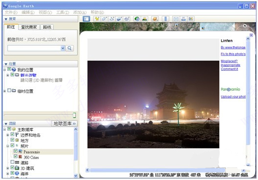 在Search面板的Fly To输入框中,输入一个经纬度,按回车,就可以直接“飞”到那个位置。其间采用的那种动画效果,让我们产生一种遨游地球的奇妙感觉。