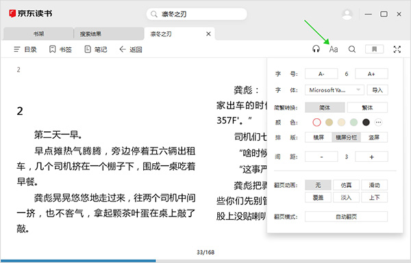 用户还可以点击如下图绿色箭头所指的图标对阅读的文本大小、字体样式、字体颜色等进行设置