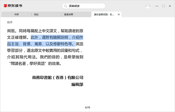 用户登录成功后即可发现京东读书电脑版其页面设计简约,顶部搜索框可以让用户快速搜索出想要的书籍,中间部分全是平台精心为用户推荐的全网热门畅销的电子书籍。用户无论是通过搜索还是点击推荐书籍都会进入书籍详情页面中,该页面中介绍整个书籍的整体信息,并且还有添加书架按钮可供用户点击后即可添加到书架中进行阅读。阅读时用户可以使用鼠标或键盘翻页键进行翻页阅读,还可以对书籍中的文本大小、样式、颜色进行个性设置。除此之外,京东读书电脑版还可支持离线阅读和语音阅读,让用户能够更加沉浸在阅读的海洋中,有需要的用户可以在本站免费下载使用。