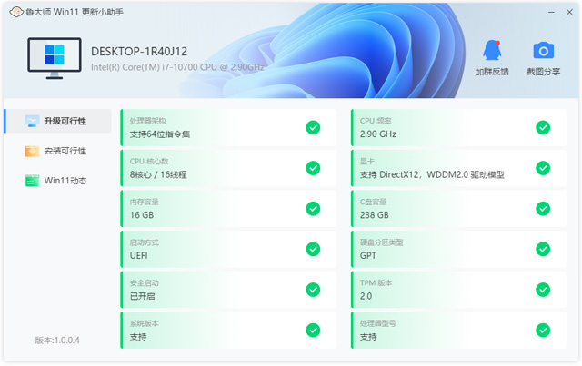 鲁大师win11更新小助手是一款挺实用的小工具,主要用来检测电脑能不能升级到Windows 11。它完全免费,功能挺全面的,包括检查升级可行性、安装可行性,还有各种Win11相关的动态资讯。用这个工具的话,可以快速知道自己的电脑硬件和系统是否符合升级条件,比如处理器架构、CPU核心数、显卡型号、TPM版本这些信息都能详细列出来。