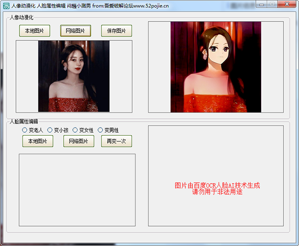 最近看到一个挺有意思的东西——人像动漫化软件。这是一款可以把真人照片变成漫画风格的工具,开发者是个叫闷骚小溅男的小哥哥,出自吾爱破解网站。软件功能很强大,不仅可以从本地或者网络加载图片,还能一键保存到手机里。最让我觉得酷的是,它不仅能把人脸变成动漫风,还能编辑人脸属性,比如变小孩、变老人、变女性或男性。操作也挺简单的:打开软件,复制图片链接,上传就能完成转换。虽然只有3MB大小,但功能却很实用。我觉得这个软件特别适合喜欢个性化头像或者想给照片加点创意的朋友。毕竟现在社交媒体这么发达,有个这样的工具肯定能让你的账号看起来更独特!而且完全免费使用,真的很贴心。总之,这款软件既有趣又实用,强烈推荐给喜欢动漫风格的小伙伴们试试看!