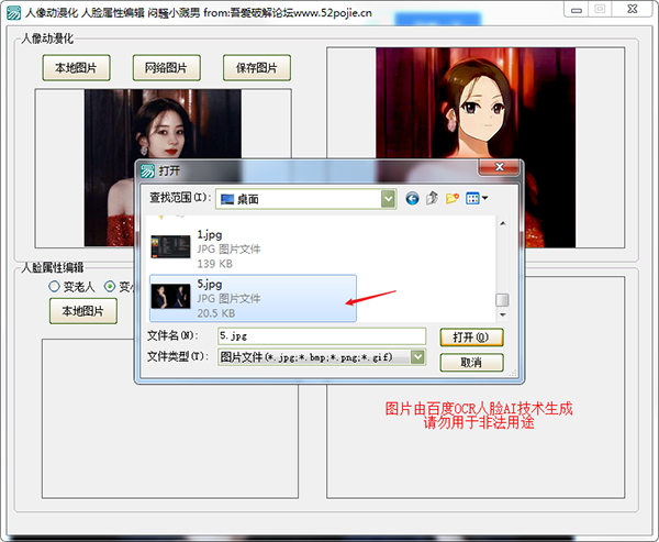5、返回软件选择人脸属性编辑,首先点击人脸属性,支持选择本地图片、网络图片,点击本地图片;