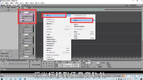 2、将光标移到任意音轨处,单击右键,点击“插入音频”;