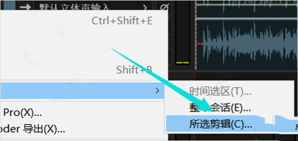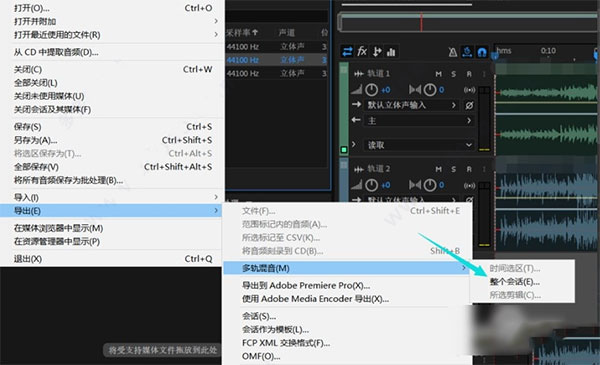 3、打开菜单选项界面之后在其中找到导出选项,然后在导出选项后方选择多轨音频,多段音频一起导出的话就需要选择多轨音频选项后面的“整个会话”;