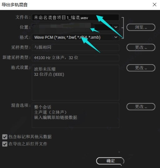 5、点击整个会话之后,就会打开一个导出多轨混音的界面,在这个界面中我们可以设置音频文件的输出参数,没有特殊需求的用户使用默认的参数设置,更改输出目录点击确定进行导出即可。