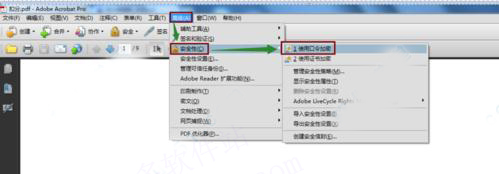 1、首先打开需要加密的pdf文档。单击 高级 - 安全性 -使用口令加密。