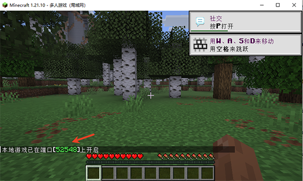 1、启动游戏后进入单人游戏界面,点击“对局域网开放”→“创造一个局域网世界”。记录左下角显示的端口号(如25565)。