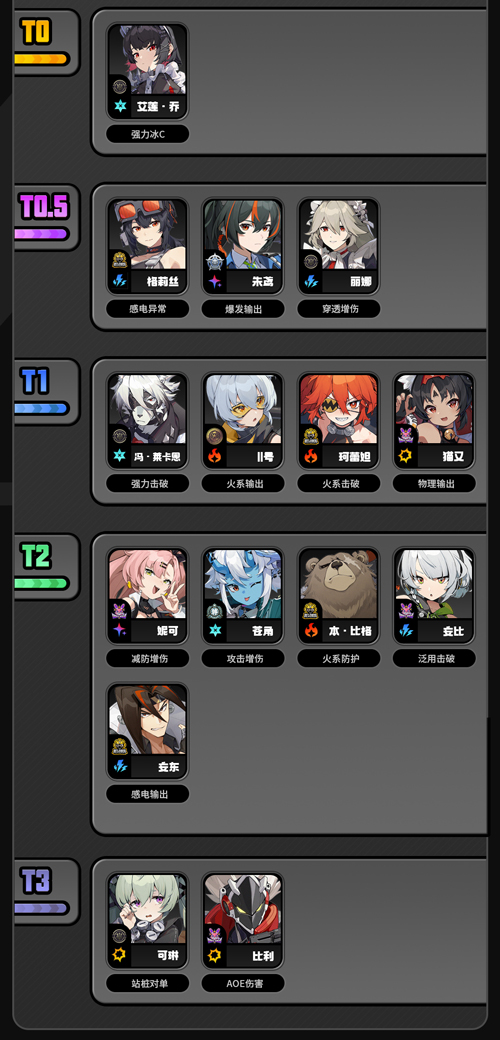 T0.5:仅次于T0梯队,这个梯队的角色本身强度不低,但是不一定版本利好,同样可以作为阵容的构建核心。