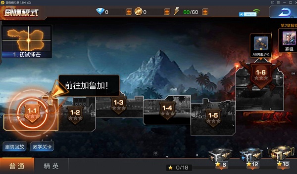 4、刚开始玩,需要通过剧情模式尽快升级,有助于提高火力,等级一定程度会限制关卡的挑战,每张图三星通关右下角会有相应的宝箱可领取,基本上奖励都一样,