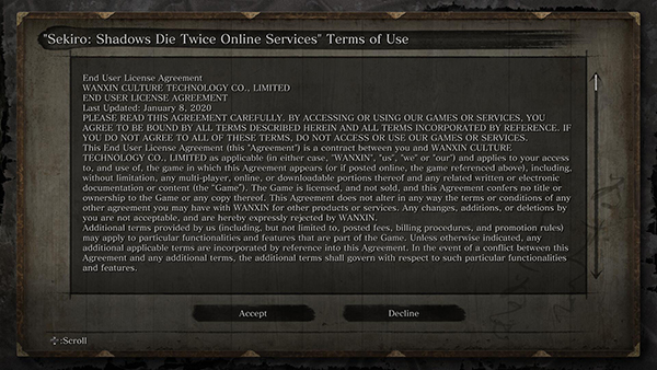 2、这里是游戏的使用条款,按住s可以快速拖动至最下方,然后选择accept接受即可;