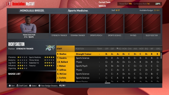 在上面的游戏截图中我们可以看到,在尝试聘请新的力量训练师时,默认排序是运动医学,这是力量训练师(以及大多数其他运动医学人员)需要的最佳属性。