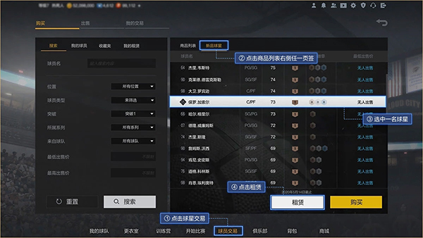 1、点击球员交易-商品列表右侧任一页签,如「新品球星」,选择一位球员-租赁。