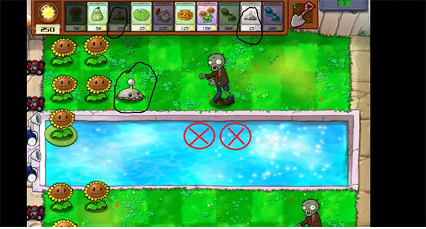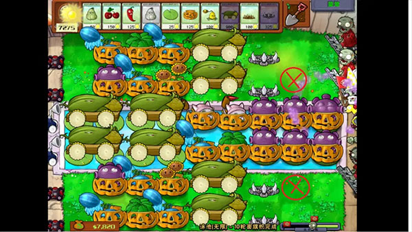 首先是前期,前几轮一定要多种向日葵积攒阳光。然后用土豆地雷来拖延时间,到有足够阳光种猫尾草时,就种猫尾草(记得加上南瓜头)水池中就种两个即可,因为猫尾草伤害尚可,攻速又快,还可以攻击全图的僵尸,是对付前期僵尸的“好东西”(这里注意一下,猫尾草在水池中只需种两个是为了后期防止气球僵尸的入侵,不要种太多占地方,水池里的僵尸非常局限,种类不多,所以要充分利用好水池,图片中画红色叉号的地方就是种猫尾草的地方。):