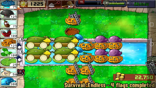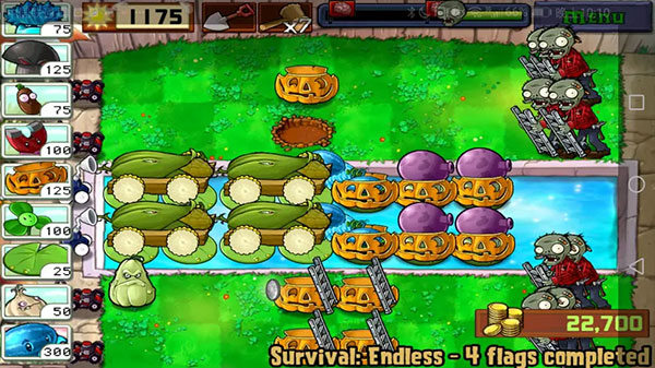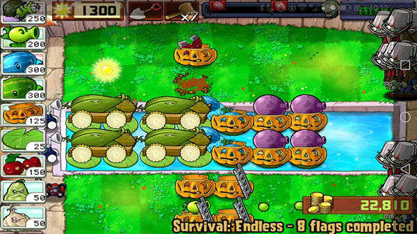 打到了5、6面旗帜时,就可以开始上“炮”了(这里注意一下,玉米加农炮不可以种南瓜头去保护,要种上玉米加农炮的玉米投手上也不能种南瓜头。):
