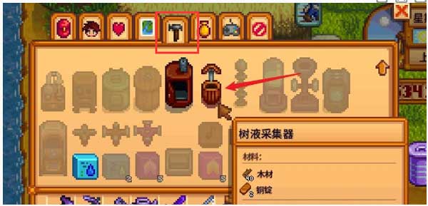 1、首先我们需要在背包里进入建造菜单,在其中制作一个树液采集器(40个木材和2个铜锭)