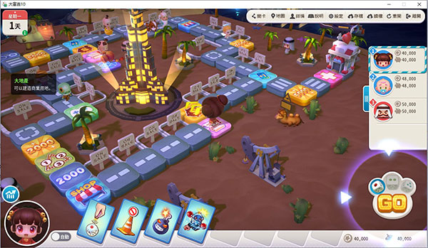 除了传统大富翁的玩法,《大富翁10》加入了最新热斗玩法。地图中取消了小型地产格,大多数地图格都是获取卡片的格子,玩家通过大量拾取、使用卡片,给敌人造成金钱伤害,使之破产,最终获得胜利。