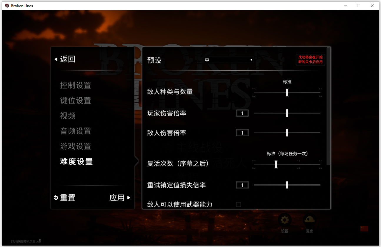 7、游戏难度设置:支持敌人种类与数量,玩家伤害倍率,复活次数等;
