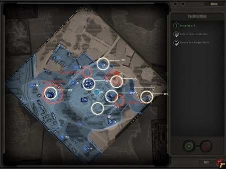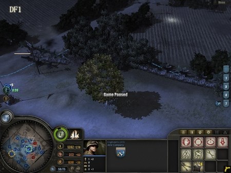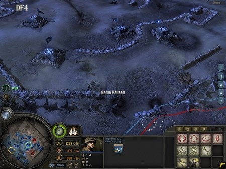 一开始,兵力分配是2队RM,两挺MG,两队工兵,还有一些零散分布在高地周围的RM。首先什么都别管,先按"F1",造两队工兵,并把旗插到高地的东南面。然后迅速分配兵力,如果你的操作很慢,可以按下暂停键,依次分配任务:北面山脚的2组零散RM抽出去占北面的弹药点和人力点。东南向山脚的两个RM占东南的人力和弹药点。抽出山顶上的一队RM,按住Shift连续占领南向小镇中的油料和弹药点,并最后依次右击山顶上的两门57mm。山顶上的两队工兵,一队到DF1去,这是你的第一道防线,所以保证它的质量非常重要,设置方法如图: