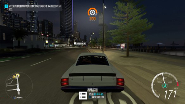 左下角为地图,地图上蓝色线路表示比赛线路,有特殊标记的圆圈则表示为赛事中车手位置。赛事模式中语音助手[ANNA]不可用。