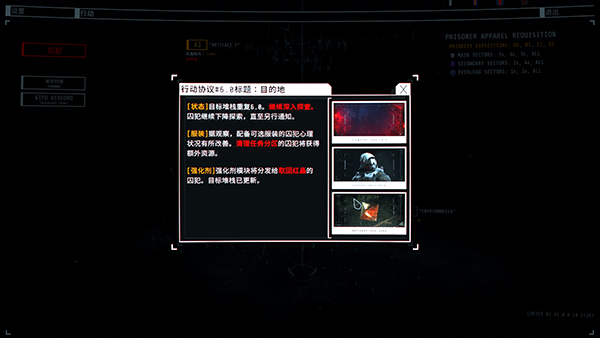 5、这里会为玩家介绍行动协议的目的地,状态、服装以及强化剂等等;