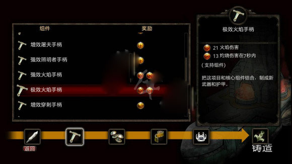 每种装备都有自己独有的核心部件,比如长剑是刃,盔甲是支柱。这些部件在不同装备间部共通。比如刃只能用来做长剑,不能用来做大剑。