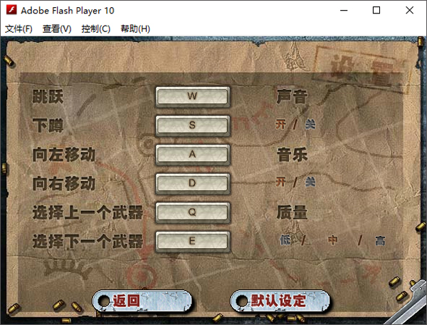 操作方法:使用W、A、S、D键或者方向键控制移动,鼠标键射击,Q/E或者鼠标滑轮切换武器。进入游戏后,点击左侧选择地图关卡,右侧的字母A~I选择武器。