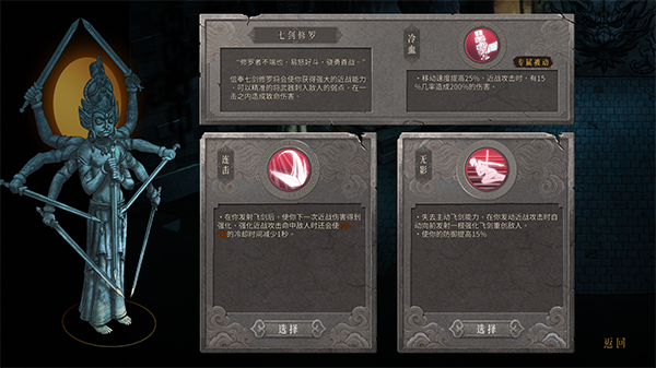 最为基础的流派,无论是连击流,还是无影流,剑的数量都有所限制,七柄飞剑立于身后的形象,也暗合了主角受到七剑修罗的庇佑。嗜杀好斗的七剑修罗,剑锋上自然不会附带什么属性伤害,但由于七剑修罗的庇佑,你的剑可以刺入敌人的体内。而你的宗门秘籍,有不少招式,都是对“身上插剑”的敌人有着加成效果。