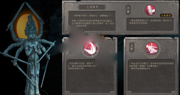 修罗者不端也,易怒好斗,骁勇善战。信奉七剑修罗将会使你获得强大的近战能力﹐可以精准的将武器刺入敌人的弱点,在一击之内造成致命伤害。