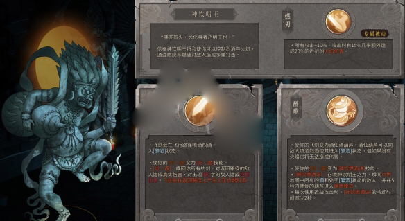 佛亦有火,忿化身者乃明王也。信奉神饮明王将会使你可以控制烈酒与火焰,通过燃烧与爆破对敌人造成多重打击。