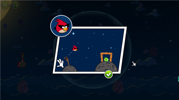 4、鼠标移动控制白色的手,然后松开即可,一共有三个红色小鸟,只有三次机会,只要击中绿色猪猪即可;
