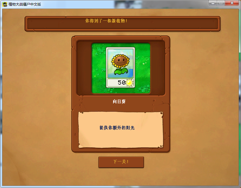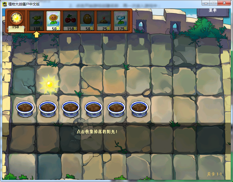 3、进入冒险模式,开始冒险,玩家需要种植向日葵获得阳光,来帮助你获得阳光种植豌豆射手;
