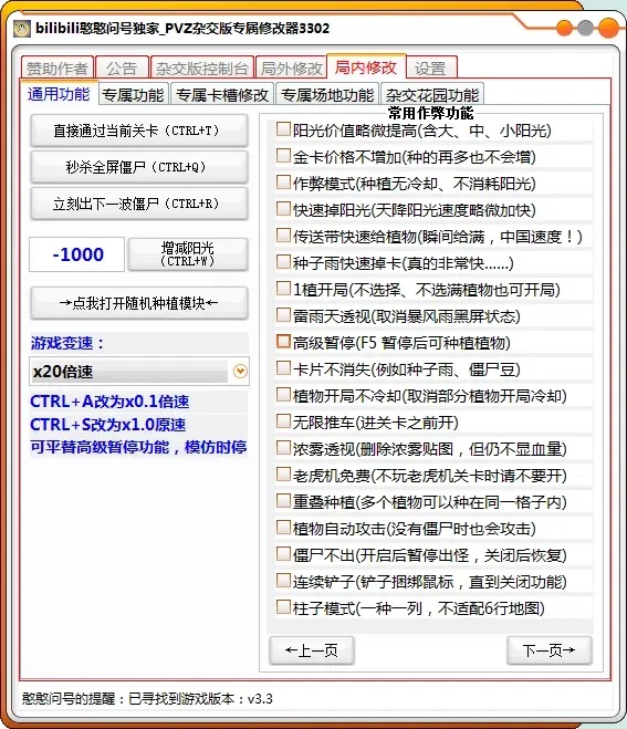 1、局内修改-通用功能-常用作弊功能,新增“柱子模式”,开启后种植植物一次可以种植竖列五个(不适配6路)