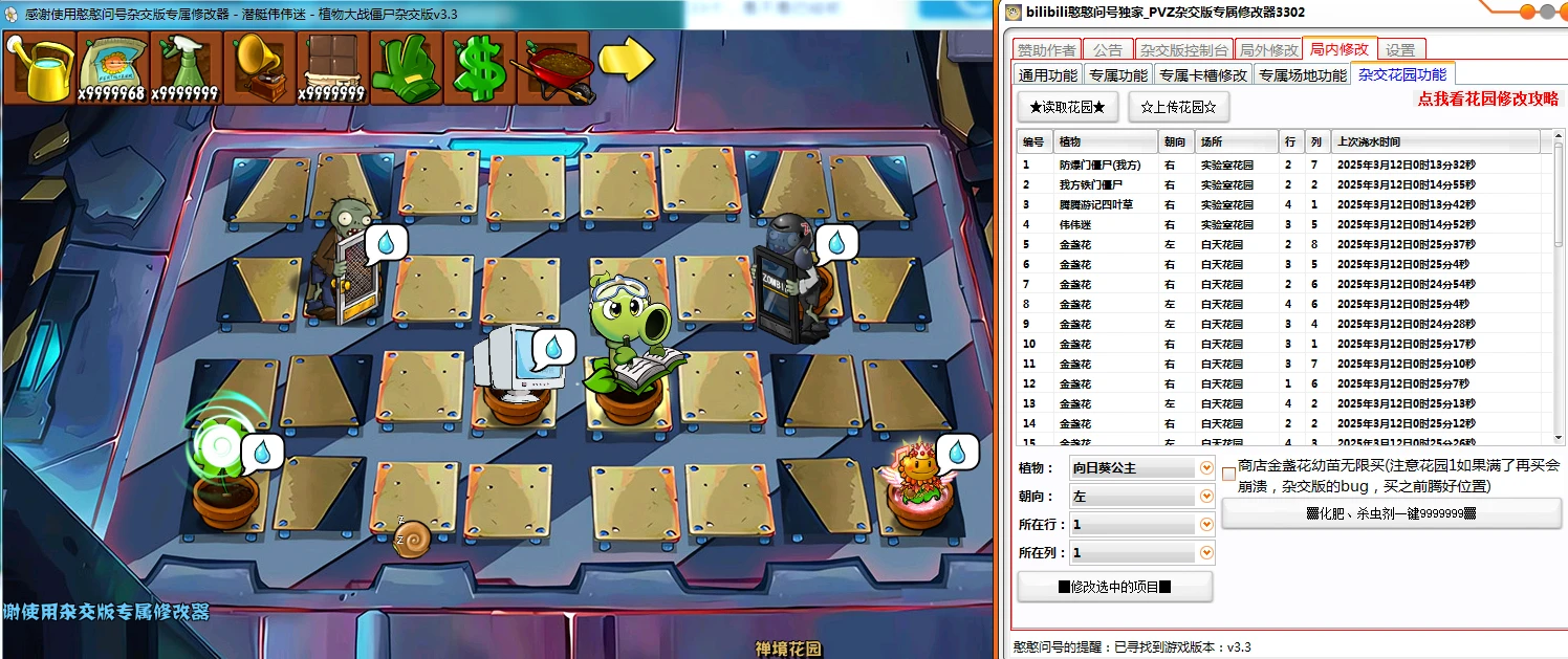9、新增“杂交花园功能”界面,支持读取花园全部数据,修改指定植物的植物类型,朝向。内置功能“商店金盏花无限买”“化肥杀虫剂9999999”,刷植物教程请点击界面中的“点我查看花园修改攻略”按钮!