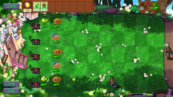 8、关卡的进度在右下方显示,当消灭所有僵尸后就可以通关,通关可以获得金币奖励,有些关卡则会给新的植物。