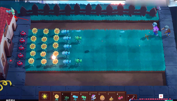 6、还有一个比较意思的点就是,过一段时间你还可以在屋顶上进行种植射手,以防一条格子上的所有植物被吃掉不能防护,这个时候屋顶的植物就可以继续攻击了
