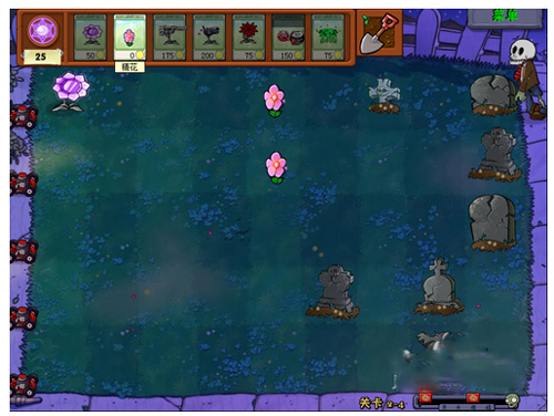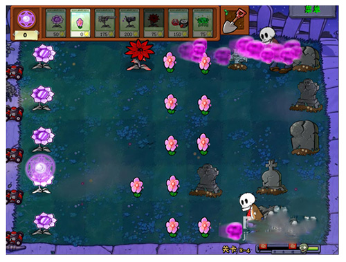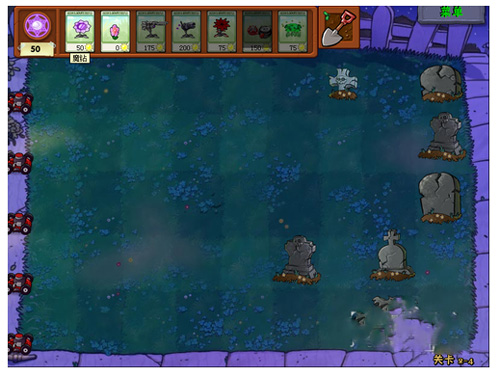 第六步:种植精花。 种植魔钻以后,再立即种植一个精花,将精花放置在僵尸出现的第四个格子里。因为精花不需要花费魔光,所以他的射程也很低,只在三个格子内。但是他非常合算。
