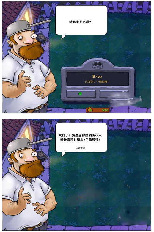 第三步:开始游戏。购买新的植物卡槽。 点击打开植物大战僵尸魔幻版游戏冒险模式2--4关以后,就会开始游戏。这时,会出现疯狂大夫。它会提示自己购买一个植物卡槽,这时,检查一下自己的金币,如果足够了。就点击确定,就会拥有一个新的植物卡槽,并且会将植物卡槽提升到7个格子。