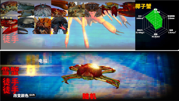 1、你是只螃蟹。为了成为周围最好的,你开始了一个世界巡回赛,以击败尽可能多的螃蟹。