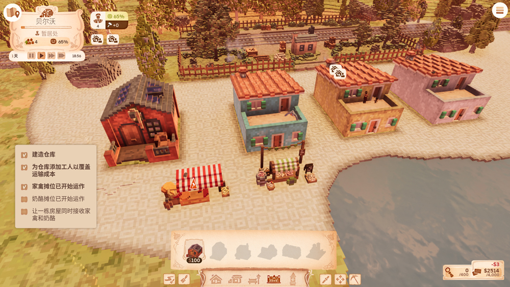 3、进入游戏如图,游戏有个简单的新手教程,跟随引导进行操作,首先建造房屋并连接房屋和车站;