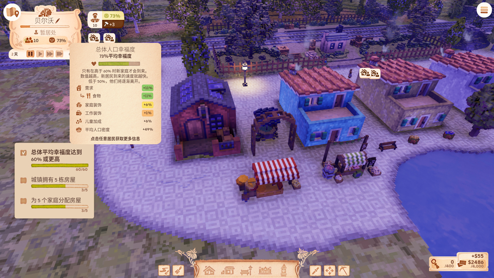 5、玩家需努力提升总体人口幸福度,以此吸引更多的新家庭住进小镇。
