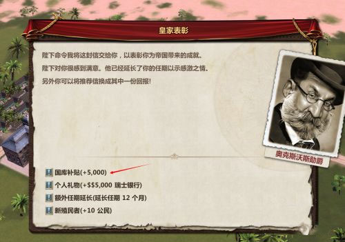 2、其中的“国库补贴”就是钱,而“瑞士银行”则是个人礼物。光靠做任务赚钱当然是远远不够的,现实中大家都知道,国家赚钱靠的是生产以及出口,那游戏中也一样,请看下一步“生产以及出口赚钱”。
