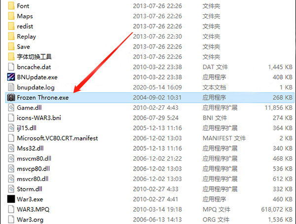 1、在本站下载好资源后解压,得到war3冰封王座免安装版游戏包,找到里面的“Frozen Throne.exe”启动文件双击启动;