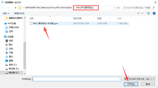 3、找到解压后同文件夹下的NGC[FPS]银河战士文件夹,点击NGC-银河战士-中文版.gcm,右下角打开;