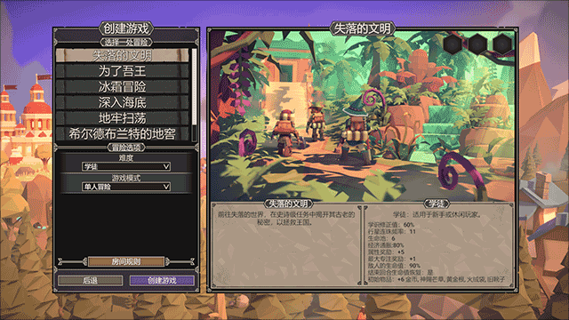 5、然后,在这里左边选择好一处冒险场景,在调节好难度、游戏模式后,就可以选择创建游戏的选项进入选择英雄的界面了;