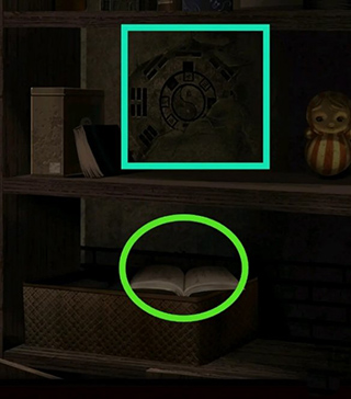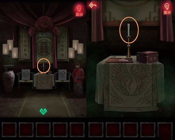 进入屋内正中央桌子上得到蜡烛。翻看绿圈书籍得到道具与提示。蓝圈后续线索开启。