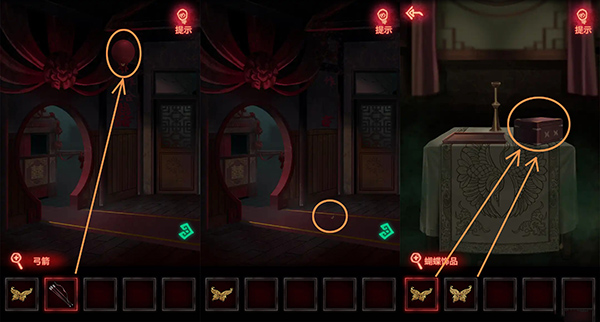 用【弓箭】拿到气球上的【蝴蝶饰品】,用【蝴蝶饰品】打开拜堂桌上的盒子,拿到【玉手镯】。