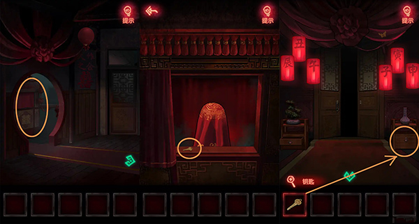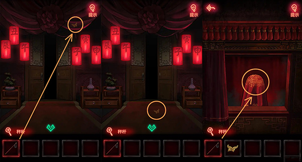 用【秤杆】拿灯笼上的【蝴蝶饰品】,再用【秤杆】揭开红盖头,拿到【弓箭】。