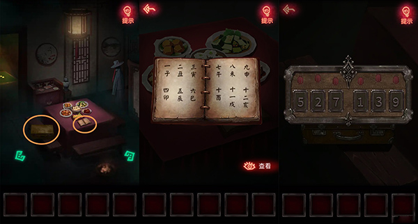 根据灯笼和饭桌上的书,得到箱子的密码,打开箱子密码:527139