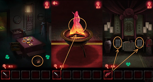 根据提示将收集到的道具放在佛像的手里,左手:上无面铜人、下红蜡烛;右手:上芭蕉叶、下死蝼蛄,中间照片。完成后第二章结束。