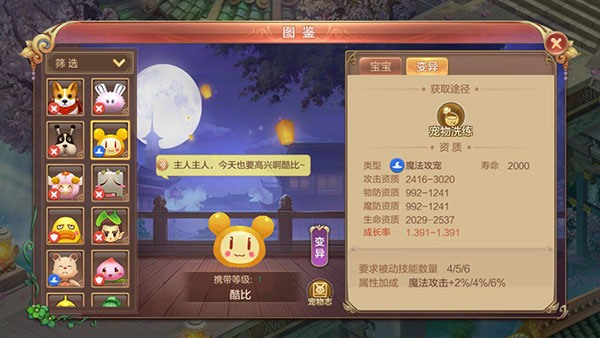 答:您可以点击“小地图下方切换按钮-宠物-炼妖-洗炼”并选中您要变异的宠物,点击“洗炼”按钮即可,洗炼需要消耗幻灵露。